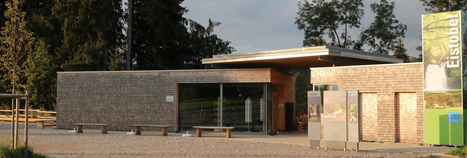 Der Eistobel-Infopavillon, der gleichzeitig den Hauptzugang zum Eistobel darstellt, befindet sich direkt an der Argentobelbrücke zwischen Maierhöfen und Grünenbach.
